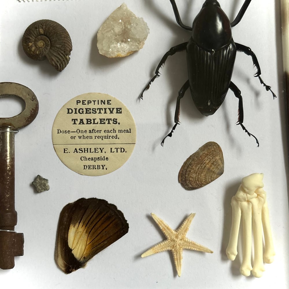 Brown trinket frame featuring a collection of hand picked items including: large weevil, partially articulated cat paw, porcupine quill, vintage ticket, stamp, key, squirrel teeth, ammonite, geode and more.